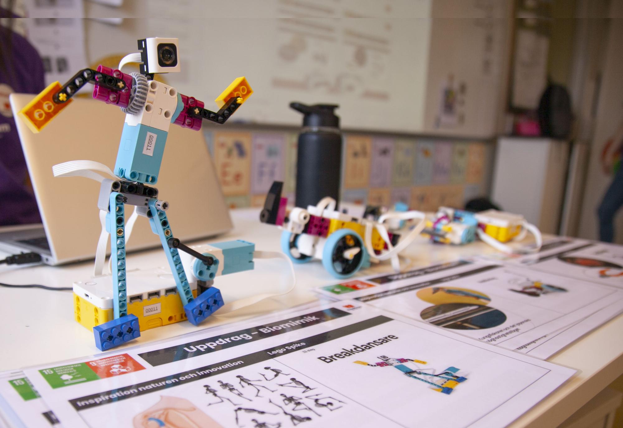 Vid tredje tillfället pratar vi om biomimik, som är ett sätt för människan att lära och hämta inspiration från naturens lösningar. Med utgångspunkt från biomimik fick eleverna bygga och programmera andra Legorobotar, som även de hade inspiration från naturen.