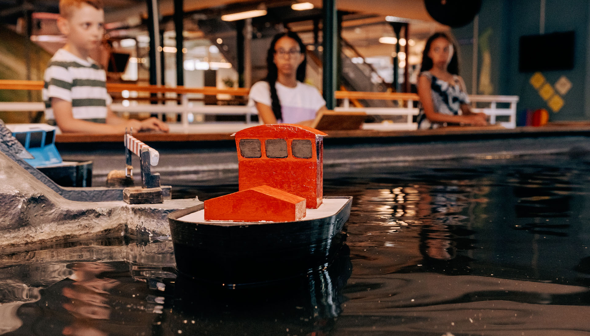 Det första du möter när du kommer upp på andra våning är vårt stora vattenland. Här kan du köra radiostyrda båtar, lotsbåtar och större lastfartyg. Bredvid vattenlandet kan du även utmana kemin i såpans värld på olika sätt.
